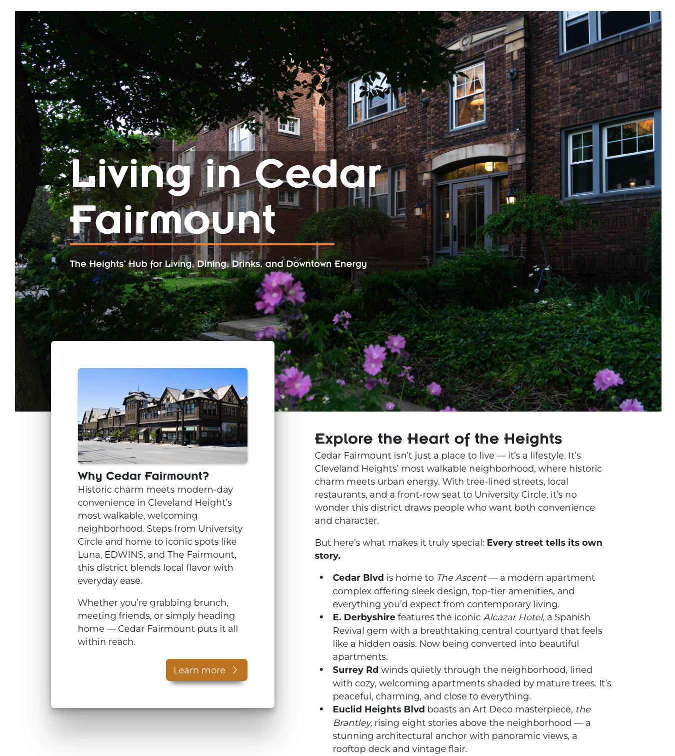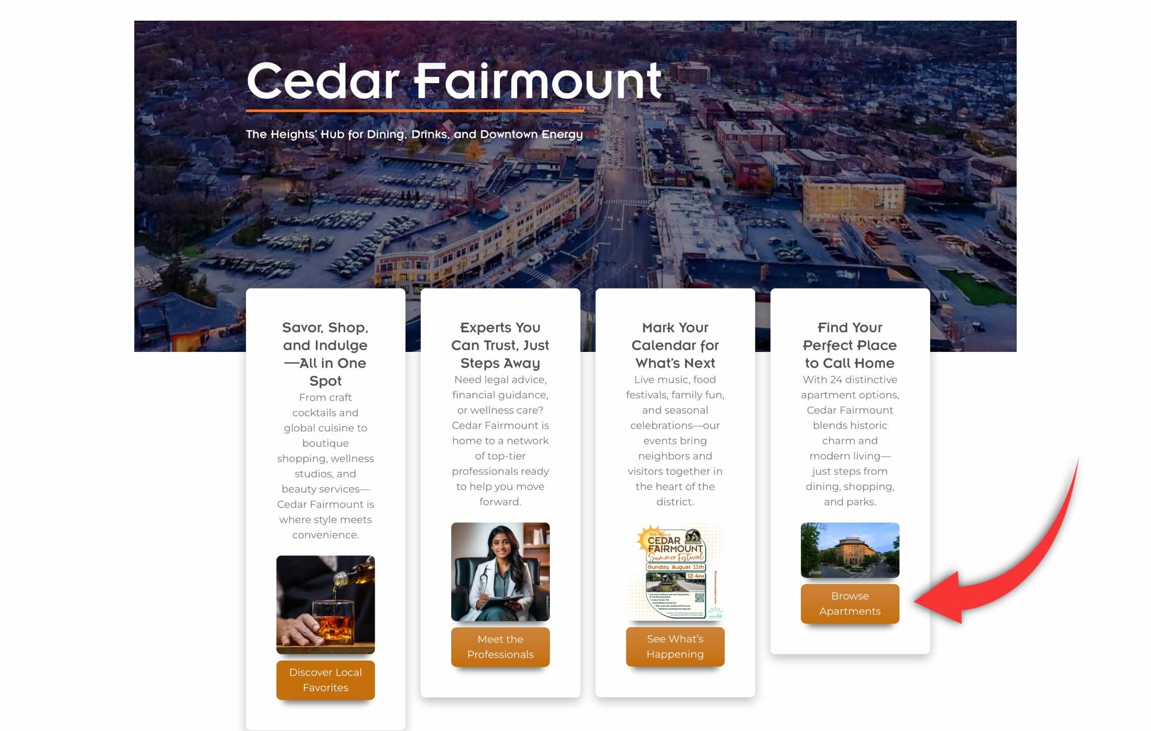 - Create site visitor interest and motivate the visitor to check out the apartments in the Cedar Fairmount neighborhood